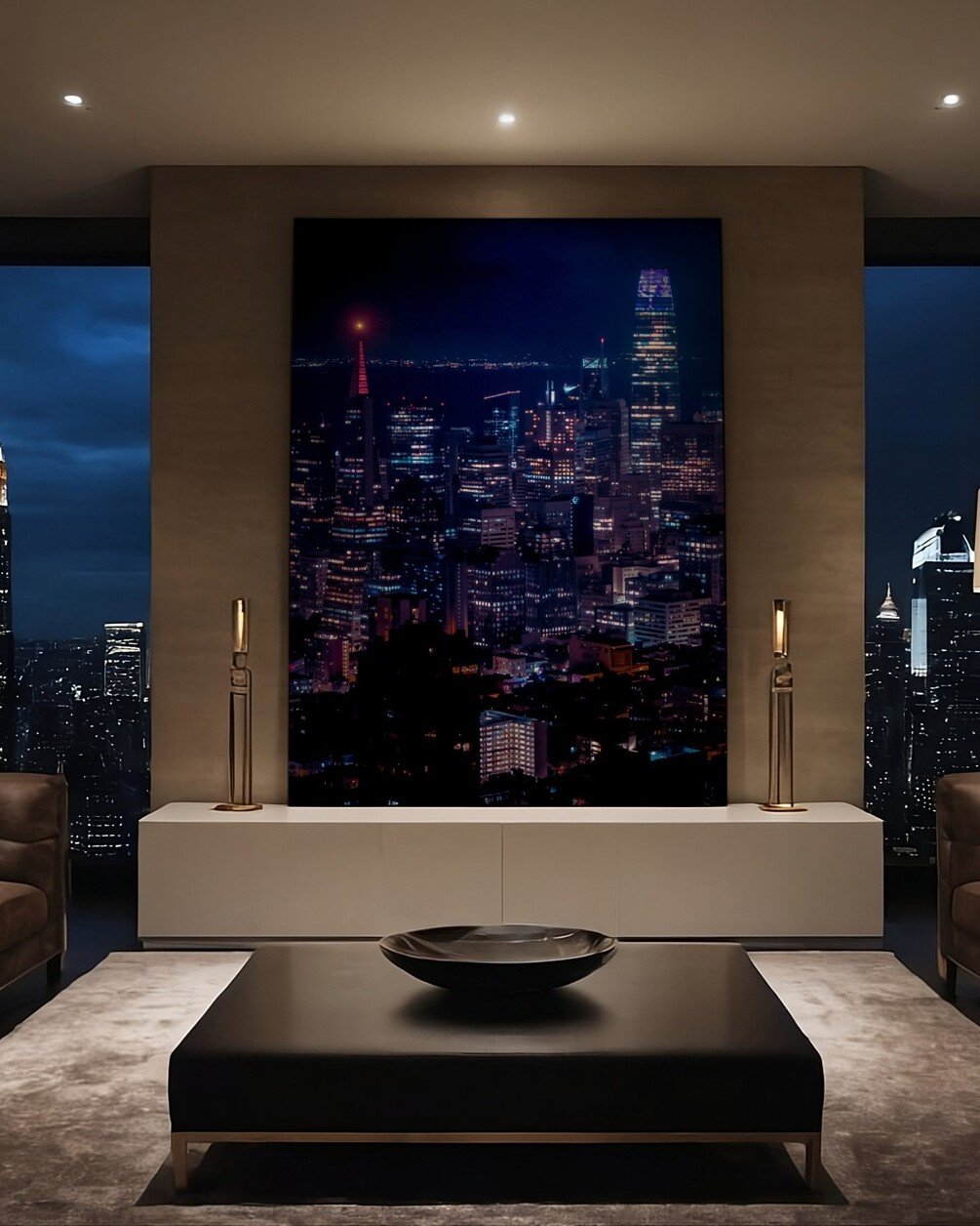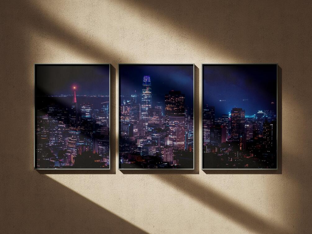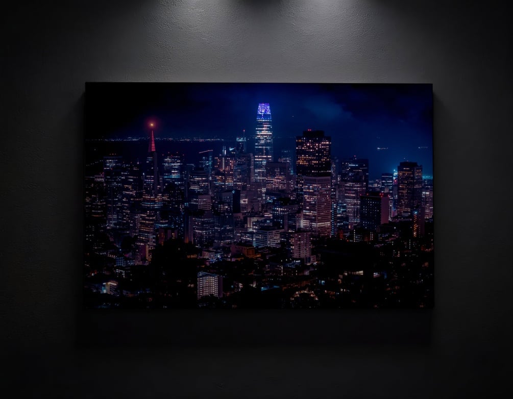 High-resolution digital print of San Francisco at night — vibrant city lights with iconic Transamerica Pyramid and Salesforce Tower. Perfect for wall art, decor, or desktop backgrounds.