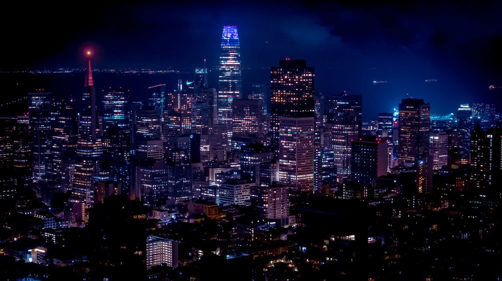 A high-resolution aerial photo of downtown San Francisco glowing under a vibrant night sky.
