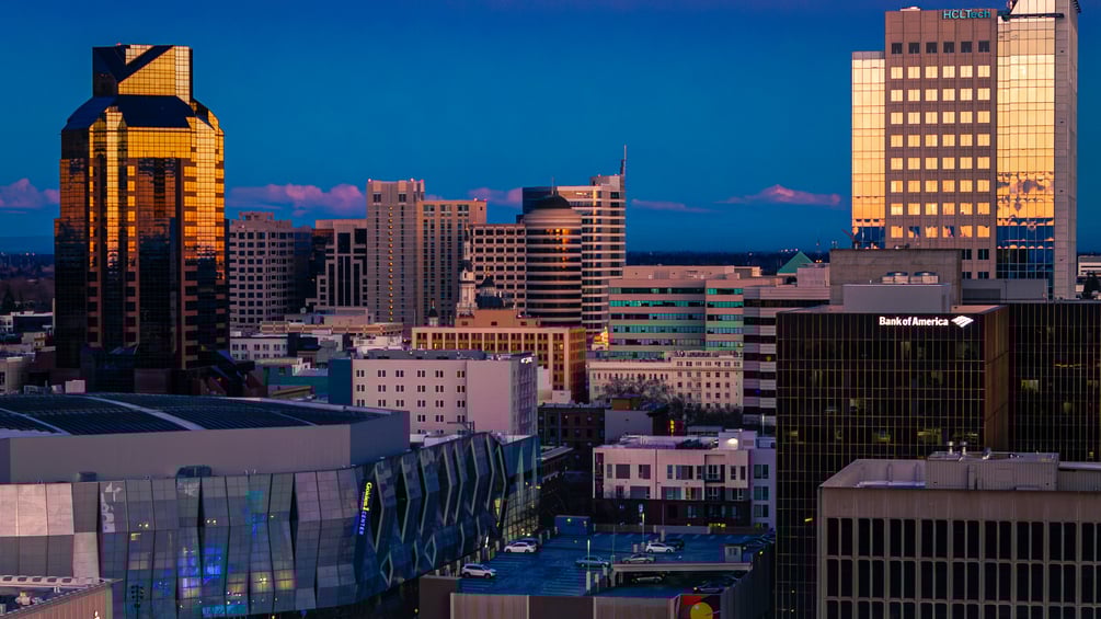 A crisp aerial image of Sacramento’s skyline during peak golden hour, reflecting vibrant color and depth. Ideal for digital or print display.