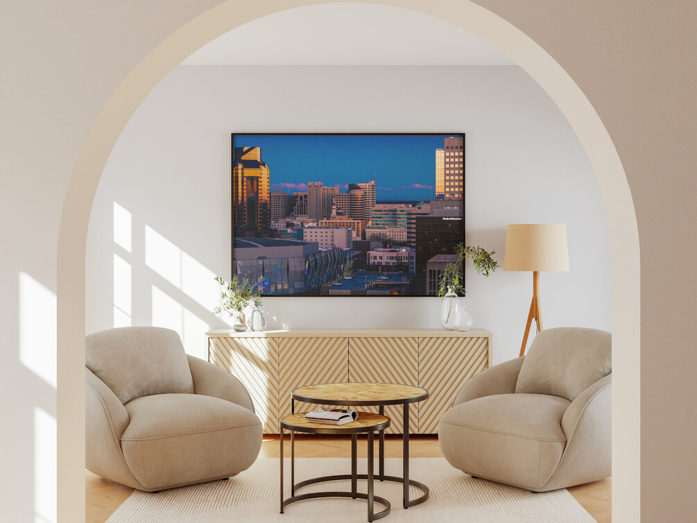 Bring the energy of downtown Sacramento into your space — captured from above Golden 1 Center with clean detail and bold color.