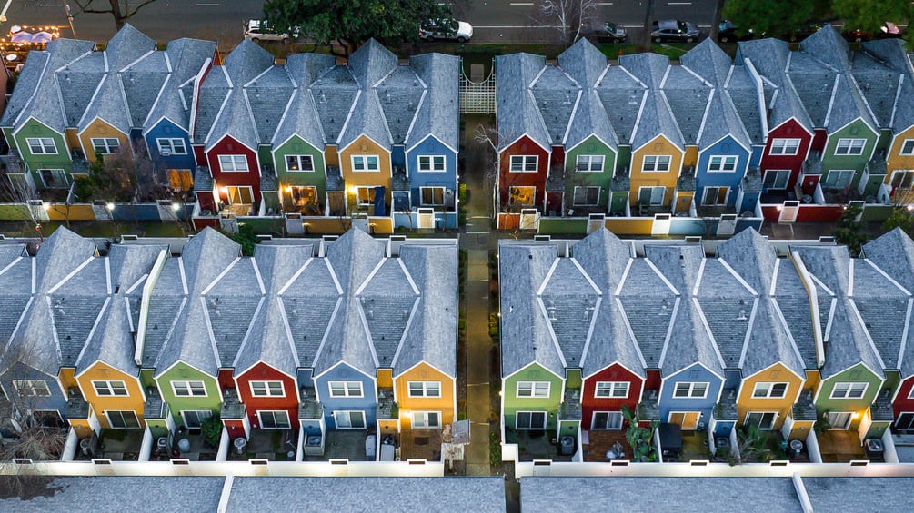 A vibrant aerial capture of Sacramento’s iconic Rainbow Row Homes, arranged in a perfect grid and bursting with color. Shot with the Mavic 3 Pro, this image offers a crisp, symmetrical look ideal for prints, backdrops, or creative use.