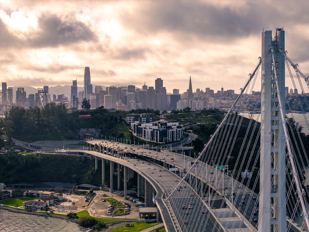 A cinematic aerial capture of the Bay Bridge leading into downtown San Francisco at golden hour. The symmetry, skyline, and motion of this scene hit with clean atmosphere and soft detail.