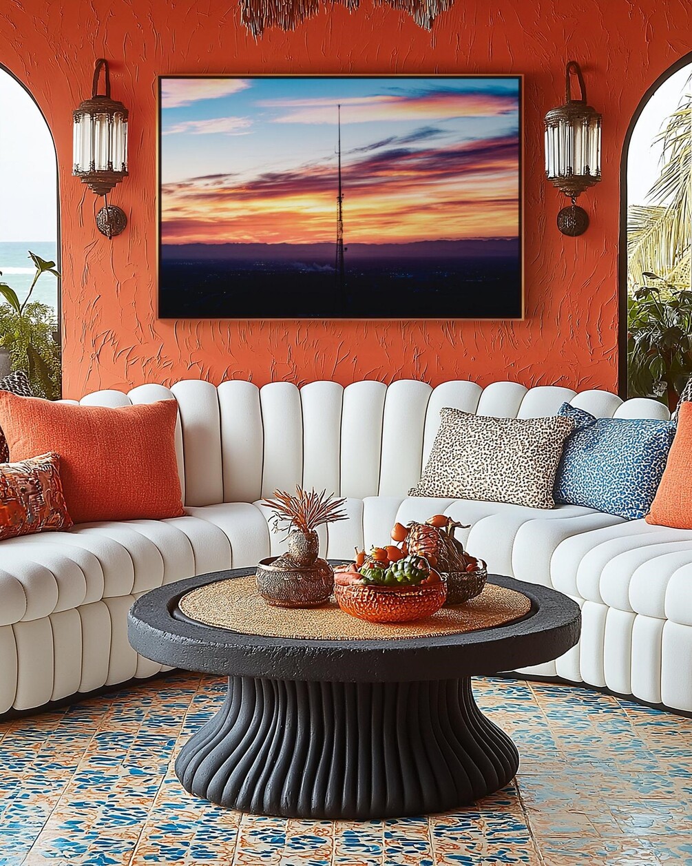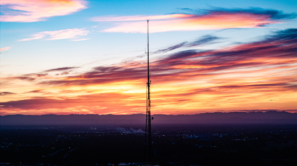 A cinematic aerial photo of Sacramento’s tallest steel broadcast tower, captured in vivid golden-hour color. Taken moments after sunrise, this high-resolution image features warm hues, minimal haze, and dramatic geometry—perfect for digital wall art, print decor, or album aesthetics.